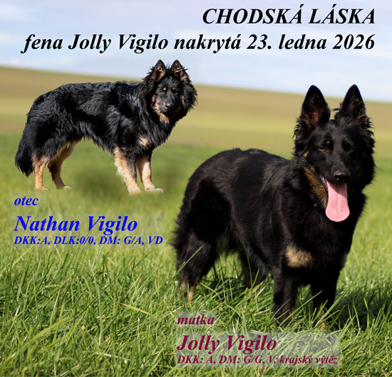 V pátek 23. ledna naše Jolly Vigilo randila. Proběhlo krytí pro plánovaný "Vrh G" chovatelské stanice Goxian. Jolly pochází z jedné ze dvou větví chovu Vigilo, a tak jsme ke krytí mohli využít statného pejska Nathana Vigilo z druhé větve chovu, takže je spojení s nulovou příbuzností. Na narození štěňátek se budeme těšit od 23. do 26. března 2026.